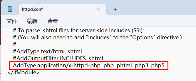 - 修改httpd.conf内容,尝试使用.php3、.php5、.phtml 绕过;文件修改完成后重启Apache 服务