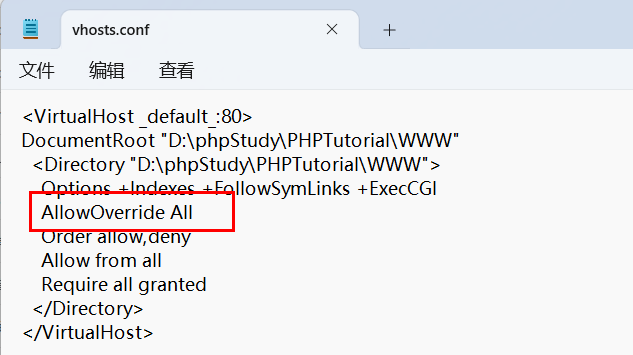 注: 需要修改Apache 的 vhost.conf 文件,将 Allowoverride None 修改为 Allowoverride All 并重启 Apache;否则.htaccess