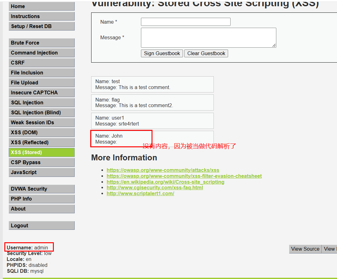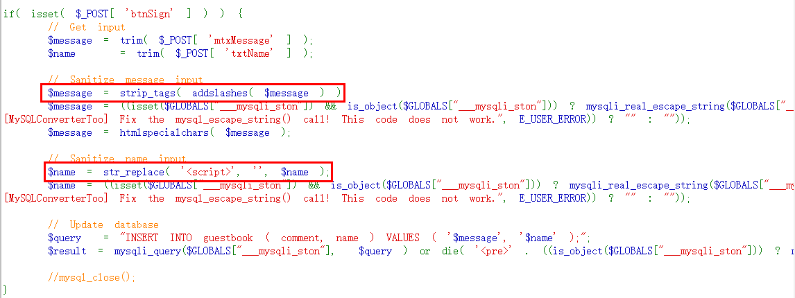 通过代码可以看出name 过滤掉了小写的script,message 增加了转义字符并且移除了标签(<>);