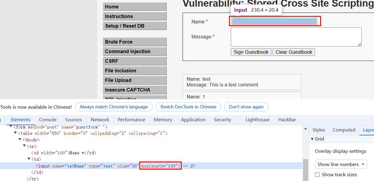 从name 入手,但是name 参数长度不支持写完全部脚本;在审查元素中找到name文本输入框对应的位置,将maxlength更改为可以支持完整输入脚本的长度,并将跨站脚本写到这个位置,提交