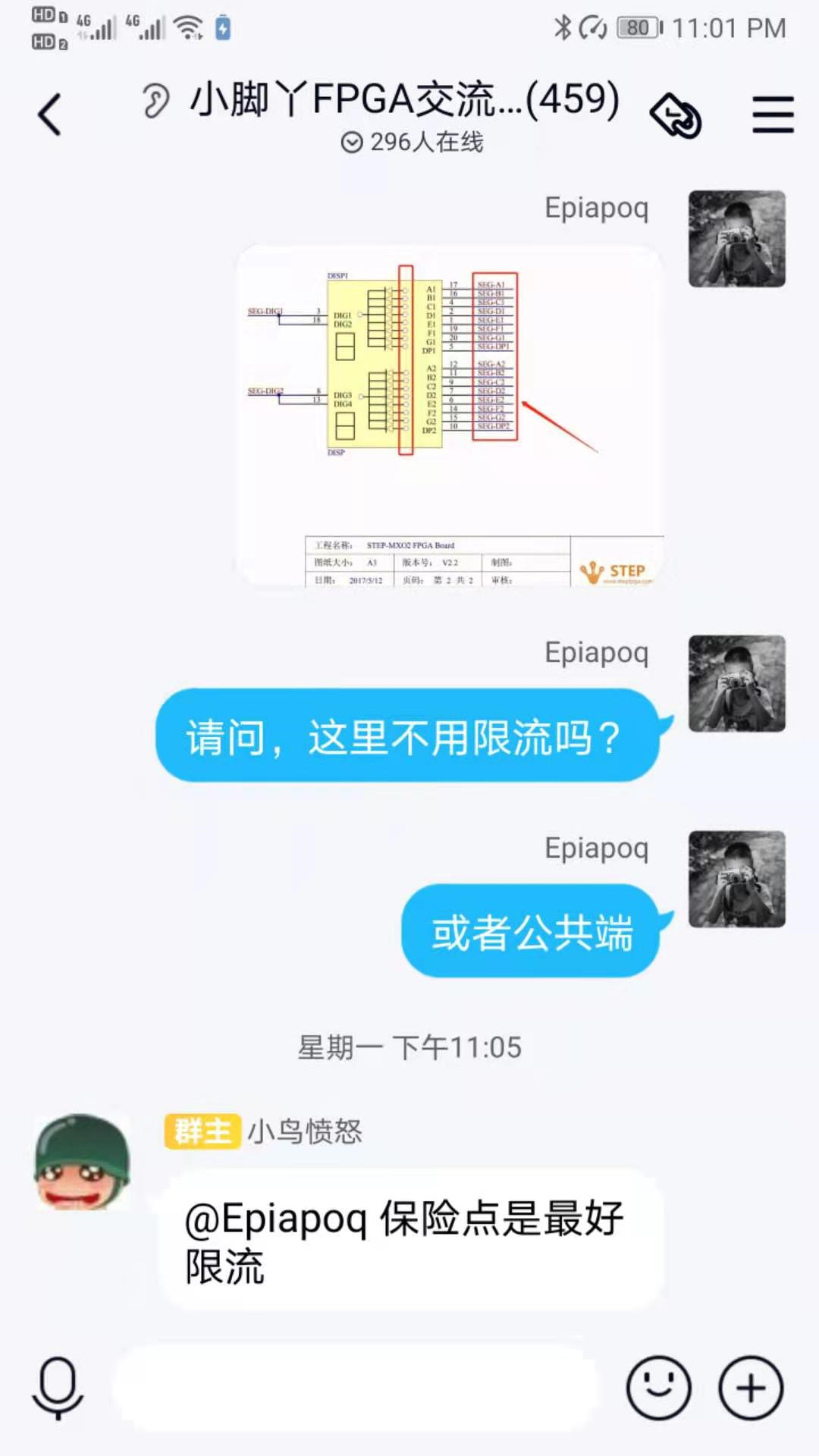 tip: 应该仔细认真的阅读厂家提供的电路原理图,这一点对于电路原理的理解至关重要,要习惯于通过厂家的资料学习专业知识,从而消弭大学课堂学习的理论课知识和工程实践之间的障碍。如果能够指出产品设计或相关文档不完善的地方就更好了,如此便产生了与厂家工程师交流的契机,快速提高自己的实操水平。比如该开发板在驱动板载数码管时采用了直接驱动的方式,无论公共端还是各段码端都没有限流措施,可能设计者已经考虑到了核心芯片的引脚和所用数码管的内阻,能够保证安全(由于笔者没有详细查找datasheet,所以不敢妄下结论),但实际使用过程中,在静态显示时还是有一定热度,问工程师,反馈是最好做一下限流。为了使用安全,只能自己想办法,比如将公共端引脚设置为高阻状态(assign C9 = 1'bz;)的同时外接限流电阻后接地。其实这只是简单的电路知识,学过电子电路原理之后应该能够理解。