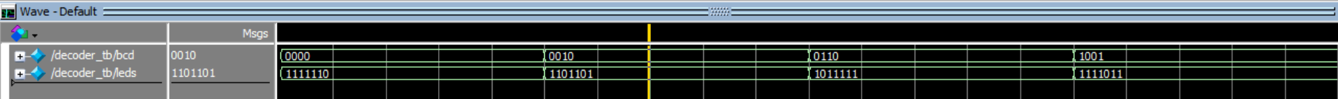 `timescale 1ns/100ps module decoder_tb; reg [3:0] bcd; wire [1:7] leds; initial begin bcd = 4'b0000; #50 bcd = 4'b0010; #50 bcd = 4'b0110; #50 bcd = 4'b1001; #50; end seg7 seg7_u1