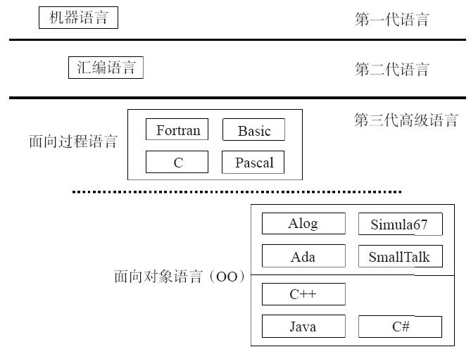 汇编语言之后又出现了第三代语言。第三代语言又叫“高级语言”。高级语言的发展分为两个阶段,以 1980 年为分界线,前一阶段属于结构化语言或者称为面向过程的语言,后一阶段属于面向对象的语言。