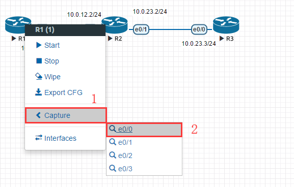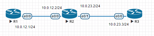 R2(config)#interface ethernet 0/0 R2(config-if)#ip address 10.0.12.2 255.255.255.0 R2(config-if)#no shutdown R2(config)#interface ethernet 0/1 R2(config-if)#ip address 10.0.23.2 255.255.255.0 R2(config-if)#no shutdown