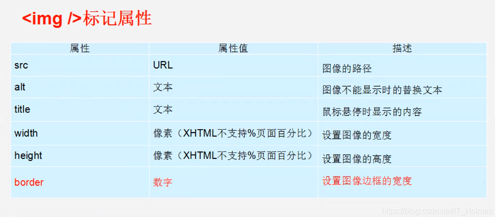 <img src = "图像URL" /> 注意:img是单标签和hr,br一样。