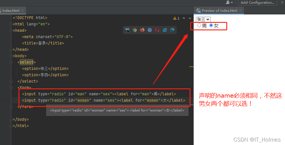 单选按钮(单选框):就是讲input的type属性赋值为radio。