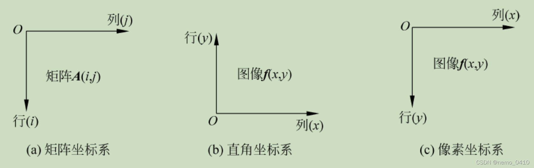 1、矩阵坐标系:坐标原点定位在左上角,一幅图像A(i,j),j表示行,垂直向下;i表示列,水平向右。