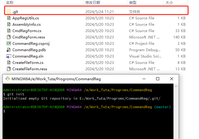 打开后输入命令git init 初始化本地仓库 生成.git文件夹保存git配置文件