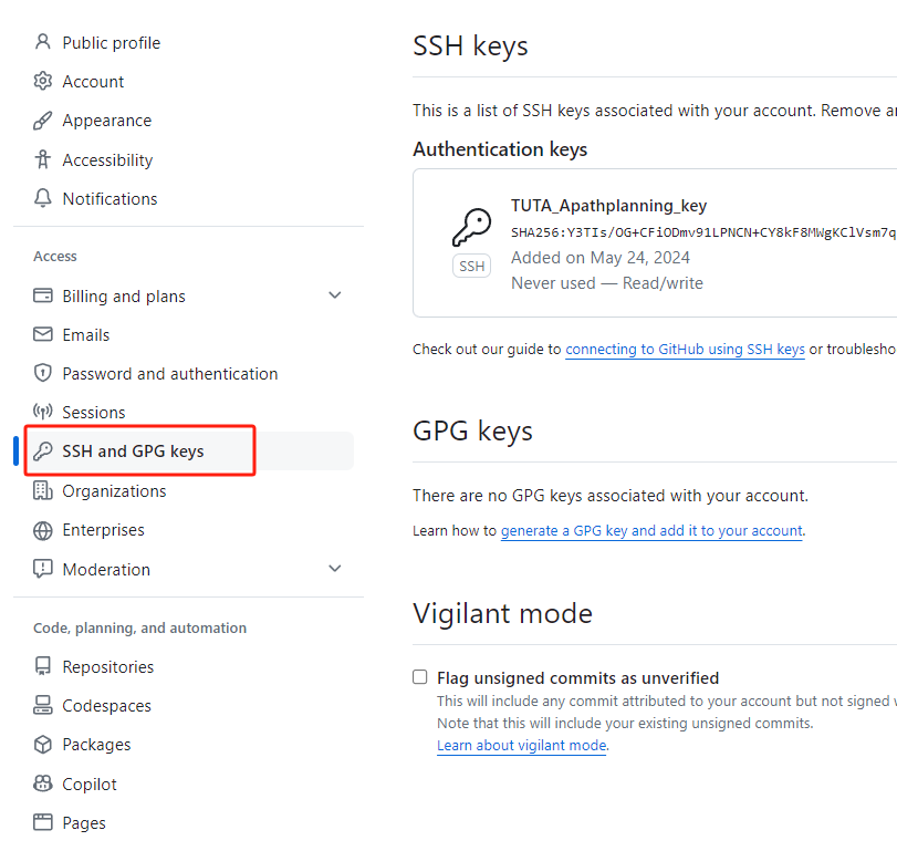 将公钥文件用记事本打开复制内容到github个人设置SHH和GPG keys