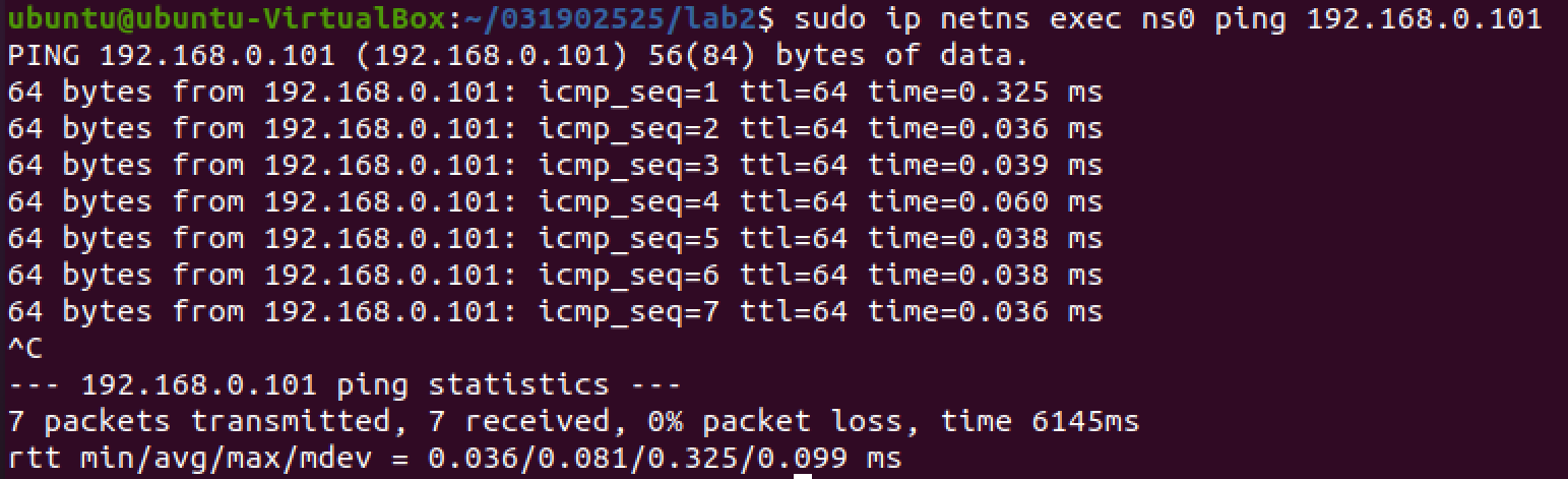 - 创建OVS交换机,并以ovs-switchxxx命名,其中xxx为本人在选课班级中的序号,例如ovs-switch001, ovs-switch088等。在创建的交换机上增加端口p0和p1,设置p0的端口号为100,p1的端口号为101,类型均为internal;为了避免网络接口上的地址和本机已有网络地址冲突,需要创建虚拟网络空间(参考命令netns)ns0和ns1,分别将p0和p1移入,并分别配置p0和p1端口的ip地址为190.168.0.100、192.168.0.101,子网掩码为255.255.255.0;最后测试p0和p1的连通性。
