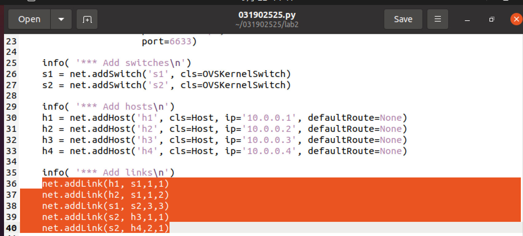 - 使用Mininet搭建的SDN拓扑,如下图所示,要求支持OpenFlow 1.3协议,主机名、交换机名以及端口对应正确。