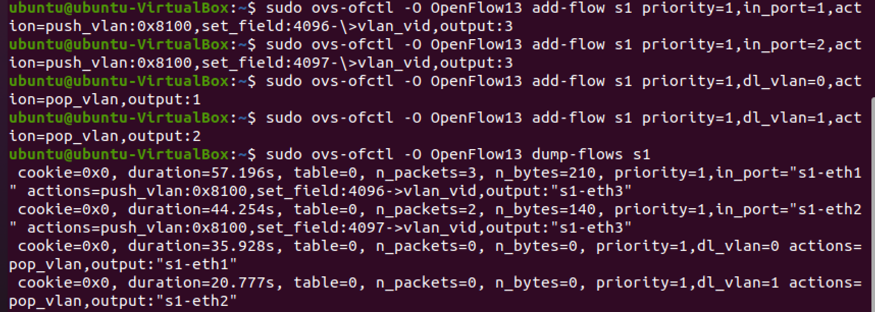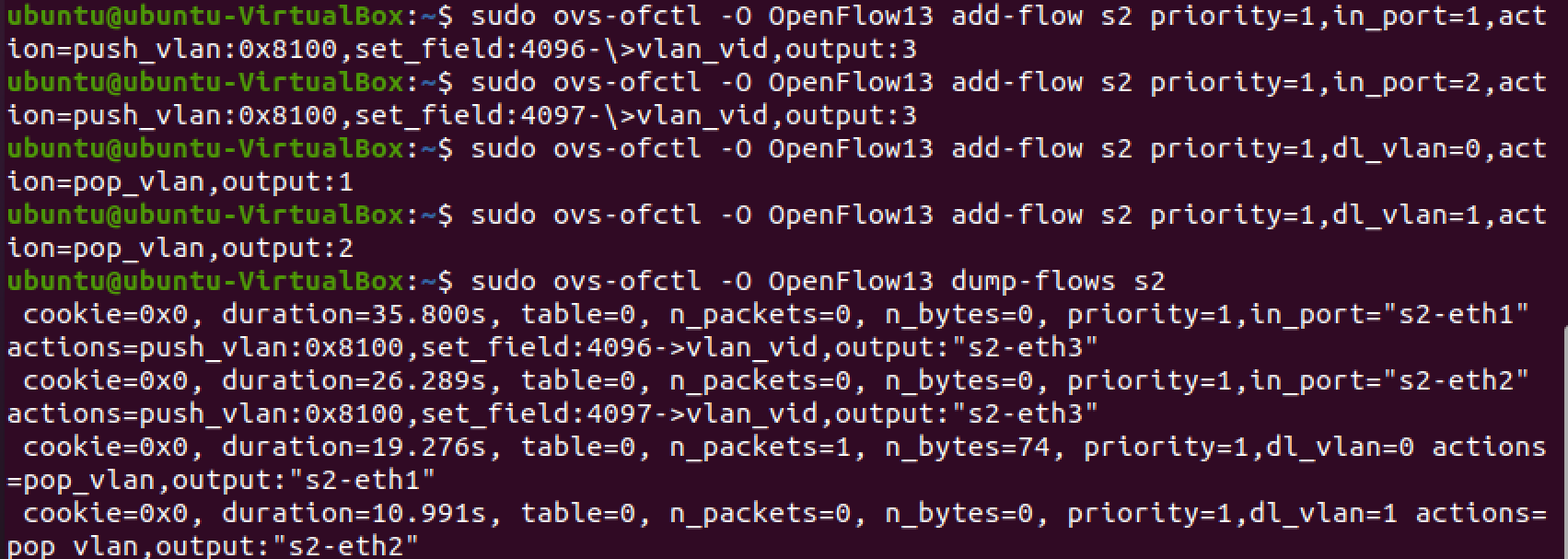 - 通过命令行终端输入“ovs-ofctl”命令,直接在s1和s2上添加流表,划分出所要求的VLAN。