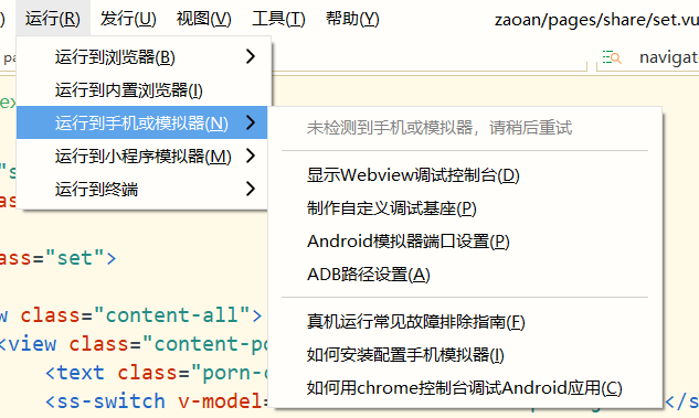 完成后再去点运行就会出现运行设备了,第一次运行会让安装HBuilder,安上后以后就不用啦。