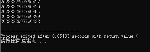 1 #include <stdio.h> 2 #include <stdlib.h> 3 #include <time.h> 4 5 #define N 5 6 #define N1 374 7 #define N2 465 8 9 int main () 10 { 11 int number; 12 int i; 13 14 srand(time(0)); 15 16 for(i=0;i<N;++i){ 17 number = rand()%(N2 - N1 + 1) + N1; 18 printf("202383290376%04d\n", number); 19 } 20 21 return 0; 22 }