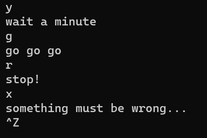 1 #include<stdio.h> 2 #include<stdlib.h> 3 int main() 4 { 5 char N; 6 while(scanf("%c",&N)!=EOF){ 7 if(N=='r') 8 printf("stop!\n"); 9 else if(N=='g') 10 printf("go go go\n"); 11 else if(N=='y') 12 printf("wait a minute\n"); 13 else 14 printf("something must be wrong...\n"); 15 getchar(); 16 17 } 18 return 0; 19 }