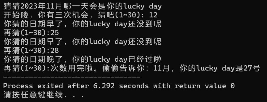 1 #include<stdio.h> 2 #include<stdlib.h> 3 #include<time.h> 4 int main() 5 { 6 int r,n,x; 7 n = 0; 8 srand (time(0)); 9 r=rand()%30+1; 10 printf("猜猜2023年11月哪一天会是你的lucky day\n开始喽,你有三次机会,猜吧(1~30): "); 11 for(n=0;n<3;n++){ 12 scanf("%d",&x); 13 if(x<r){ 14 printf("你猜的日期早了,你的lucky day还没到呢\n"); 15 if(n<3) 16 printf("再猜(1~30):"); 17 } 18 else if(x>r){ 19 printf("你猜的日期晚了,你的lucky day已经过啦\n"); 20 if(n<3) 21 printf("再猜(1~30):"); 22 } 23 else if(x==r){ 24 printf("哇,猜中了:-)"); 25 break; 26 } 27 } 28 if(n==3){ 29 printf("次数用完啦。偷偷告诉你:11月,你的lucky day是%d号",r); 30 } 31 32 return 0; 33 }