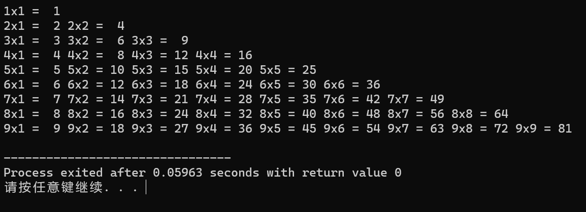 1 #include<stdio.h> 2 int main() 3 { 4 int m,n,s=0; 5 m=1; 6 n=1; 7 for(m=1;m<=9;m++) 8 { 9 for(n=1;n<=m;n++){ 10 s = m*n; 11 printf("%dx%d = %2d ",m,n,s); 12 } 13 printf("\n"); 14 } 15 return 0; 16 }