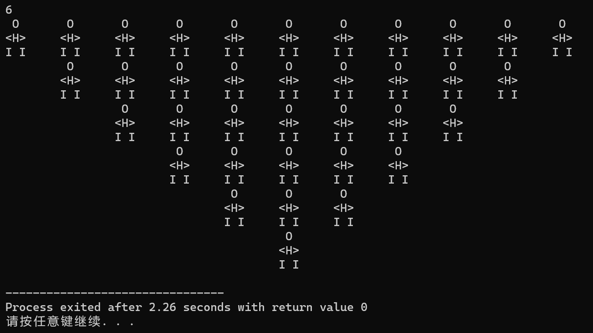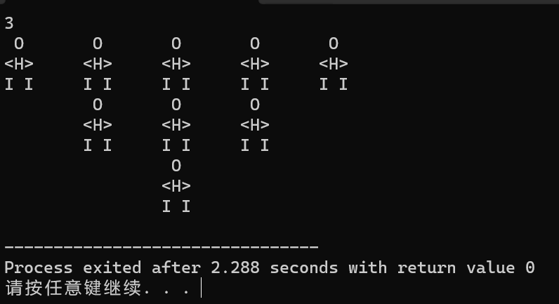 1 #include<stdio.h> 2 int main() 3 { 4 int m,n,i,a; 5 scanf("%d",&m); 6 for(n=1;n<=m;n++){ 7 for(i=1;i<n;i++) 8 printf("\t"); 9 for(a=1;a<=2*(m+1)-1-2*n;a++) 10 printf(" O \t"); 11 printf("\n"); 12 for(i=1;i<n;i++) 13 printf("\t"); 14 for(a=1;a<=2*(m+1)-1-2*n;a++) 15 printf("<H>\t"); 16 printf("\n"); 17 for(i=1;i<n;i++) 18 printf("\t"); 19 for(a=1;a<=2*(m+1)-1-2*n;a++) 20 printf("I I\t"); 21 printf("\n"); 22 } 23 return 0; 24 }