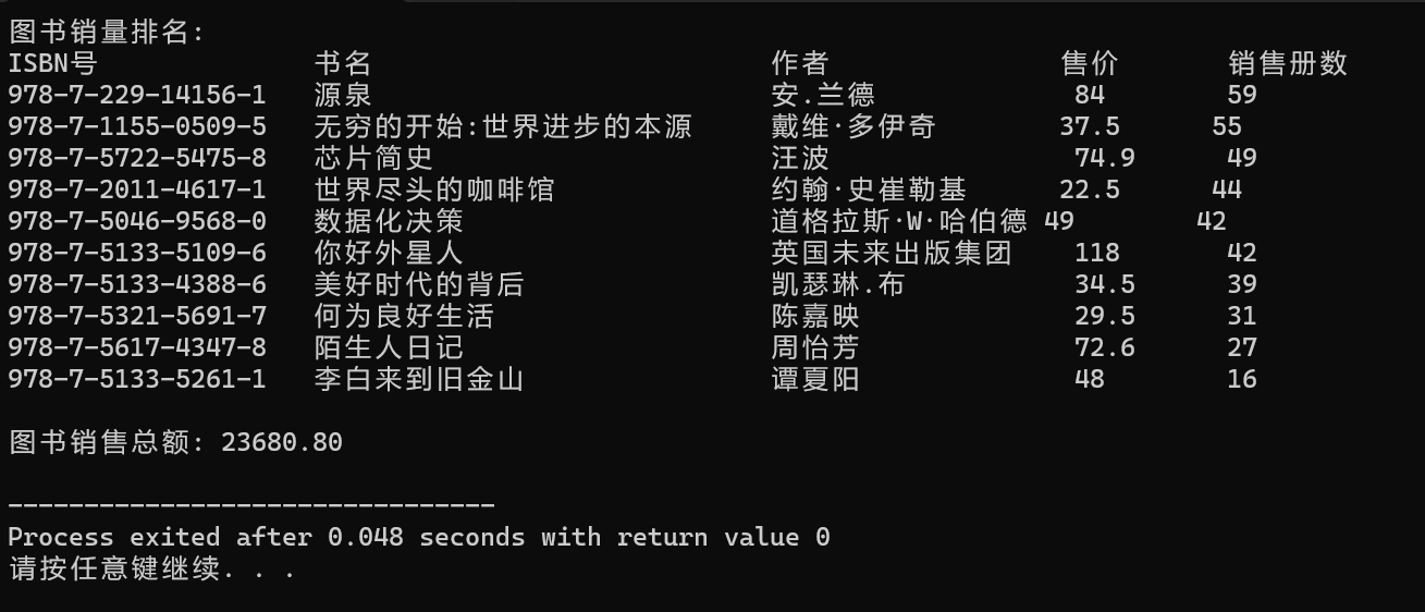 1 #include <stdio.h> 2 #define N 10 3 4 typedef struct { 5 char isbn[20]; // isbn号 6 char name[80]; // 书名 7 char author[80]; // 作者 8 double sales_price; // 售价 9 int sales_count; // 销售册数 10 } Book; 11 12 void output(Book x[], int n); 13 void sort(Book x[], int n); 14 double sales_amount(Book x[], int n); 15 16 int main() { 17 Book x[N] = {{"978-7-229-14156-1", "源泉", "安.兰德", 84, 59}, 18 {"978-7-5133-5261-1", "李白来到旧金山", "谭夏阳", 48, 16}, 19 {"978-7-5617-4347-8", "陌生人日记", "周怡芳", 72.6, 27}, 20 {"978-7-5722-5475-8", "芯片简史", "汪波", 74.9, 49}, 21 {"978-7-5046-9568-0", "数据化决策", "道格拉斯·W·哈伯德", 49, 42}, 22 {"978-7-5133-4388-6", "美好时代的背后", "凯瑟琳.布", 34.5, 39}, 23 {"978-7-1155-0509-5", "无穷的开始:世界进步的本源", "戴维·多伊奇", 37.5, 55}, 24 {"978-7-5321-5691-7", "何为良好生活", "陈嘉映", 29.5 , 31}, 25 {"978-7-5133-5109-6", "你好外星人", "英国未来出版集团", 118, 42}, 26 {"978-7-2011-4617-1", "世界尽头的咖啡馆", "约翰·史崔勒基", 22.5, 44}}; 27 28 printf("图书销量排名: \n"); 29 sort(x, N); 30 output(x, N); 31 32 printf("\n图书销售总额: %.2f\n", sales_amount(x, N)); 33 34 return 0; 35 } 36 37 // 待补足:函数output()实现 38 // ××× 39 void output(Book x[], int n){ 40 int i; 41 printf("ISBN号 书名 作者 售价 销售册数\n"); 42 for(i = 0; i < n; i++){ 43 if(x[i].sales_price == (int)x[i].sales_price){ 44 printf("%-20s%-30s%-20s%-10.0f%-5d\n",x[i].isbn, x[i].name, x[i].author, x[i].sales_price , x[i].sales_count); 45 } 46 else 47 printf("%-20s%-30s%-20s%-10.1f%-5d\n",x[i].isbn, x[i].name, x[i].author, x[i].sales_price , x[i].sales_count); 48 } 49 } 50 51 // 待补足:函数sort()实现 52 // ××× 53 void sort(Book x[], int n){ 54 int i, j; 55 Book mid; 56 for(i = 0; i < n - 1; i++){ 57 for(j = 0; j < n - 1 - i; j++){ 58 if(x[j].sales_count < x[j+1].sales_count){ 59 mid = x[j + 1]; 60 x[j + 1] = x[j]; 61 x[j] = mid; 62 } 63 } 64 } 65 } 66 67 // 待补足:函数sales_count()实现 68 // ××× 69 double sales_amount(Book x[], int n){ 70 int i; 71 double sum = 0.0; 72 for(i = 0; i < n; i++){ 73 sum += x[i].sales_price * x[i].sales_count; 74 } 75 return sum; 76 }