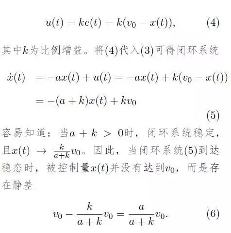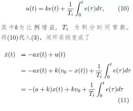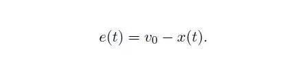 其中 u 为控制输入(也即控制器的输出),y为被控系统的输出(控制器的输入)。我们期望被控量 x 能够达到一个给定的常值 v_0. 令 e(t) 为给定值和被控量的偏差,即: