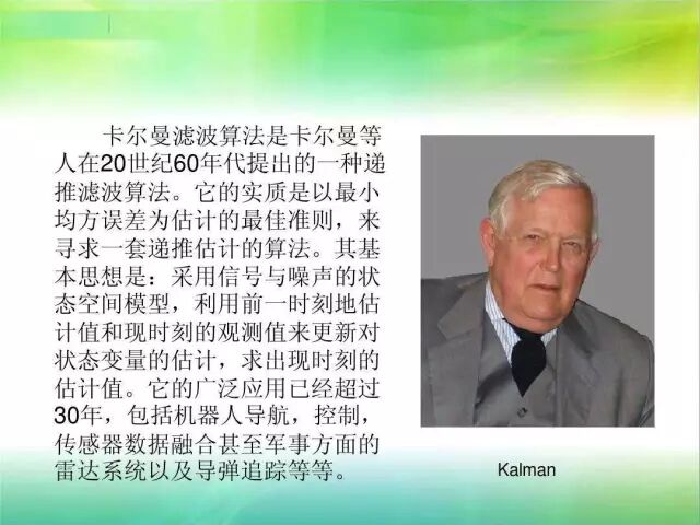 数据滤波是去除噪声、还原真实数据的一种数据处理技术。绝大多数滤波方法在本质上都是数据的加权平均,不同的加权方法产生了不同的滤波器。卡尔曼滤波就是采用统计方法来设计权重的。Kalman滤波在测量方差已知的情况下能够从一系列存在测量噪声的数据中,估计动态系统的状态。 由于它便于计算机编程实现, 并能够对现场采集的数据进行实时的更新和处理, Kalman滤波是目前应用最为广泛的滤波方法, 在通信、导航、制导与控制等多领域得到了较好的应用。