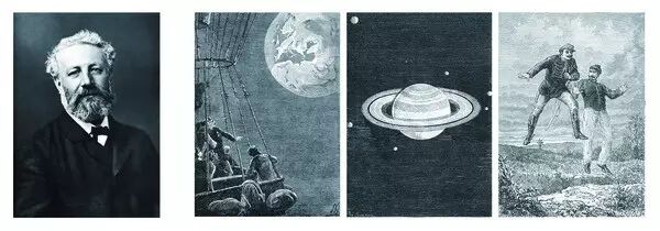 (左)凡尔纳。(Félix Nadar 摄)(右)法国画家 Paul D. Philippoteaux 绘製、Charles Laplante 镌刻的《太阳系历险记》插图。场景包括在太空中见到欧洲、俄国、法国;土星和卫星;漂浮的人物。引起19世纪读者对外太空的想像与热情。(维基)