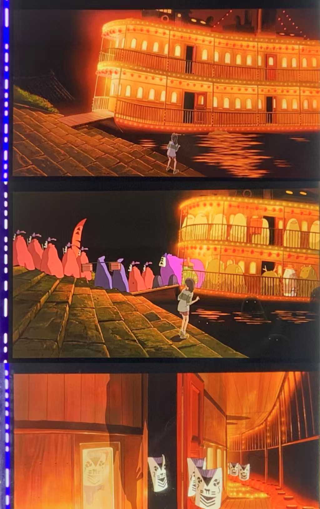 - This scene is about:In the evening, Chihiro carefully walked onto an ancient bridge in search of his parents who had become pigs. At this moment, the various translucent spirits passed by her to the oil house at the other end of the bridge, and Chihiro observed it all nervously and curiously.