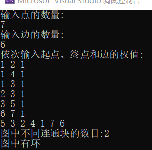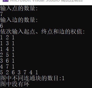 1 #include <iostream> 2 #include <algorithm> 3 #include <stack> 4 #define N 100 5 using namespace std; 6 stack<int>s; 7 int edge[N][N]; 8 int color[N], father[N]; 9 int n, edges; 10 bool hasCircle = false; 11 void init() 12 { 13 for (int i = 1; i <= n; ++i) { 14 for (int j = 1; j <= n; ++j) { 15 edge[i][j] = INT_MAX; 16 } 17 } 18 } 19 20 void dfs(int u) 21 { 22 color[u] = 2; 23 for (int j = 1; j <= n; ++j) { 24 if (u != j && edge[u][j] != INT_MAX) { 25 if (color[j] == 1) { 26 father[j] = u; 27 dfs(j); 28 } 29 else if (color[j] == 2 && father[u] != j) { 30 hasCircle = true; 31 } 32 } 33 } 34 color[u] = 3; 35 cout << u << " "; 36 } 37 38 int GraphTravel() 39 { 40 int count = 0; 41 for (int i = 1; i <= n; ++i) { 42 if (color[i] == 1) { 43 count++; 44 dfs(i); 45 } 46 } 47 return count; 48 } 49 50 int main() 51 { 52 int start, end, weight; 53 cout << "输入点的数量:" << endl; 54 cin >> n; 55 for (int i = 1; i <= n; ++i) { 56 color[i] = 1; 57 father[i] = 0; 58 } 59 cout << "输入边的数量:" << endl; 60 cin >> edges; 61 cout << "依次输入起点、终点和边的权值:" << endl; 62 init(); 63 for (int i = 1; i <= edges; ++i) { 64 cin >> start >> end >> weight; 65 edge[start][end] = weight; 66 edge[end][start] = weight; 67 } 68 int num = GraphTravel(); 69 cout << endl; 70 cout << "图中不同连通块的数目:" << num << endl; 71 if (hasCircle) { 72 cout << "图中有环" << endl; 73 } 74 else { 75 cout << "图中没有环" << endl; 76 } 77 return 0; 78 }