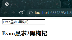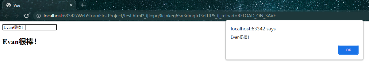 <!DOCTYPE html> <html lang="en"> <head> <meta charset="UTF-8"> <meta name="viewport" content="width=device-width, initial-scale=1.0"> <meta http-equiv="X-UA-Compatible" content="ie=edge"> <title>Vue</title> </head> <body> <div id="app"> <input type="text" v-model="message"> <h2>{{ message }}</h2> </div> <script src="https://cdn.jsdelivr.net/npm/vue/dist/vue.js"></script> <script> var app = new Vue({ el:"#app", data:{ message:"Evan!", }, methods:{ } }) </script> </body> </html>