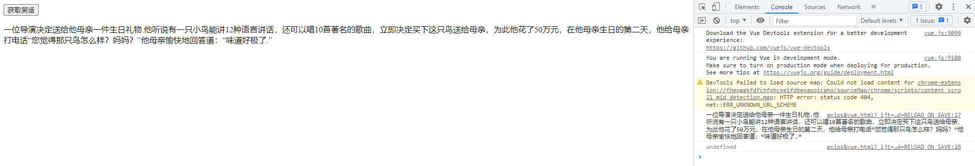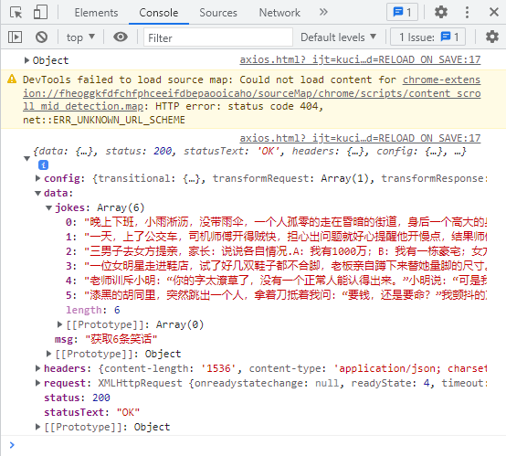 当然了,由于我们定义在data中的joke这个是有一个初始值的,而我们想要实现点击就更新的话,其本质就是把获取到的数据赋给这个joke.但是,这里会有一个问题,我们可以直接this.joke = response.data吗?答案是不行的,我直接说了就。你可以去测试一下,这里的this.joke会变(打印出来是:undefined)。因此,我们还需要在axios发送请求之前,把这个原来的数据保存,直接var that = this就可。
