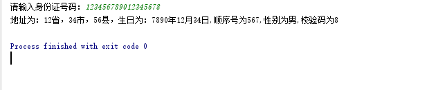 def get_id_code(id): province = id[0:2] city = id[2:4] county = id[4:6] year = id[6:10] month = id[10:12] day = id[-6:-4] SN = id[-4:-1] if int(id[-2]) %2 != 1: sex = '女' else: sex = '男' check = id[-1] print("地址为:{}省,{}市,{}县,生日为:{}年{}月{}日,顺序号为{},性别为{},校验码为{}".format(province,city,county,year,month,day,SN,sex,check)) id = input("请输入身份证号码:") get_id_code(id)