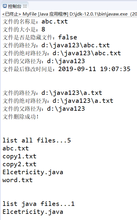1)用3种方式创建文件对象“d:\java123\abc.txt”,并获取此文件的名称和文件大小、是否隐藏文件、路径、绝对路径、父路径、最后修改时间等信息。