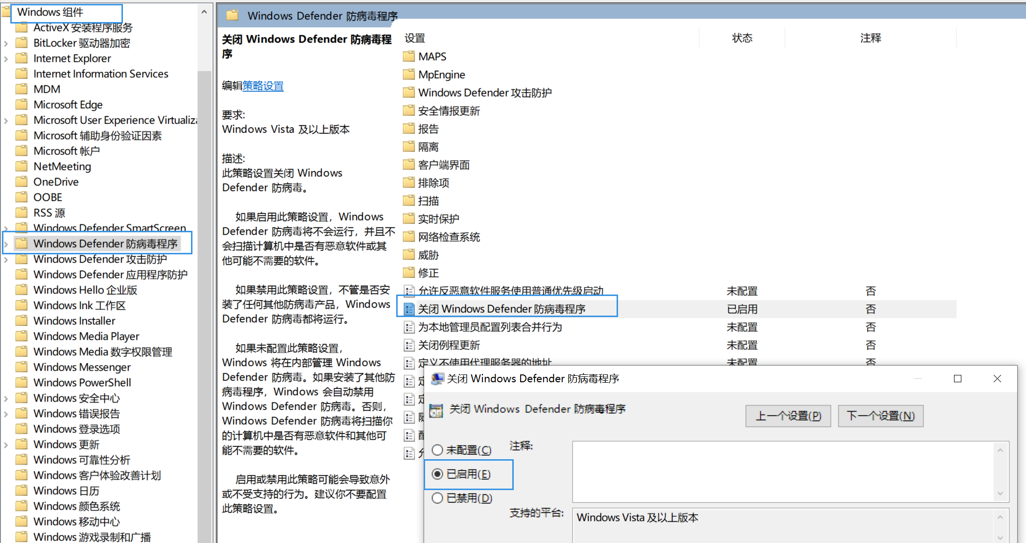 3、找到“关闭Windows Defender防病毒程序”选项,右键“编辑“,选择“已启用”,确定即可。
