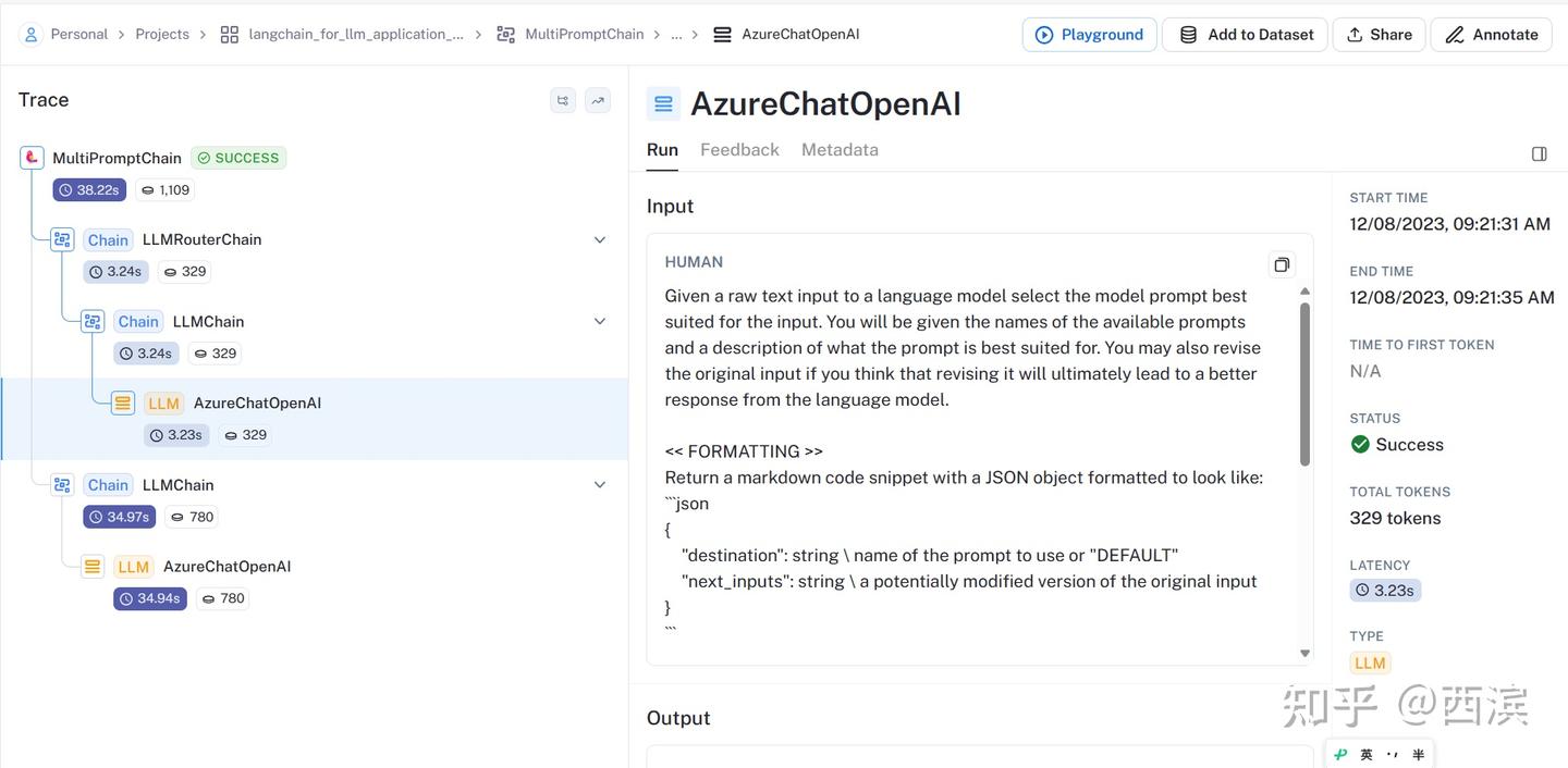 从图中,我们可以很直观的看到LangChain组件的调用顺序(如果有用过微服务的Zipkin,对这个界面应该不陌生)、每一步耗费的时间、调用OpenAI消耗的Token数。