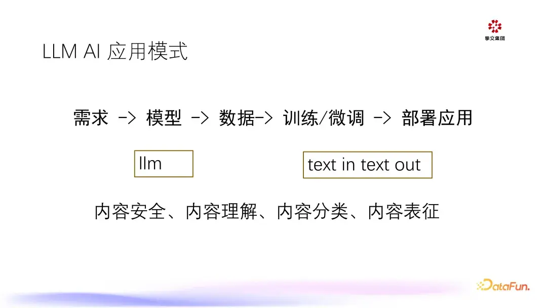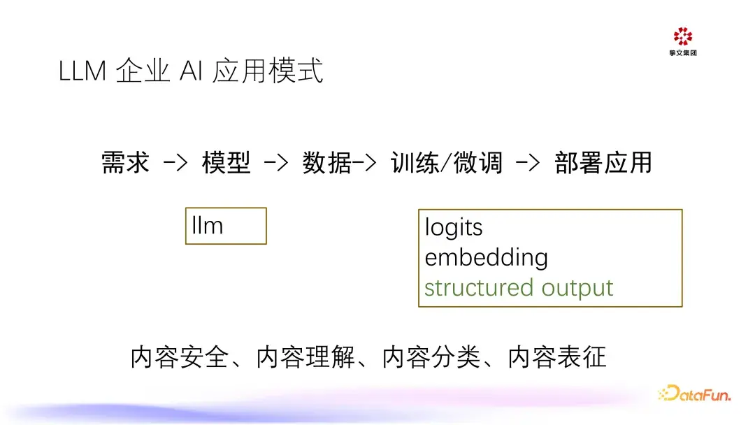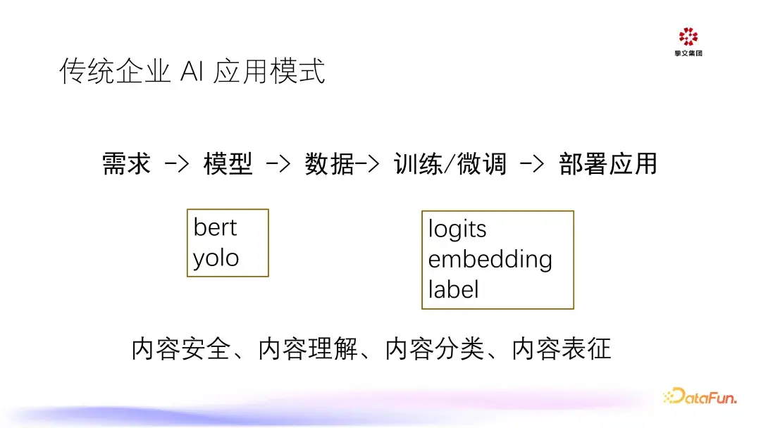 传统的企业 AI 应用通常呈现如下模式:从需求开始,然后到模型、数据,再经过训练/微调,直至最终完成部署应用。传统情形下,企业内部往往借助 BERT 模型来处理 NLP 相关问题,利用 YOLO 模型解决 CV 类问题,其产出形式包括 logits、embedding 和对内容的打标等等。从业务类型来看,主要涵盖内容安全、内容理解、内容分类以及内容表征。