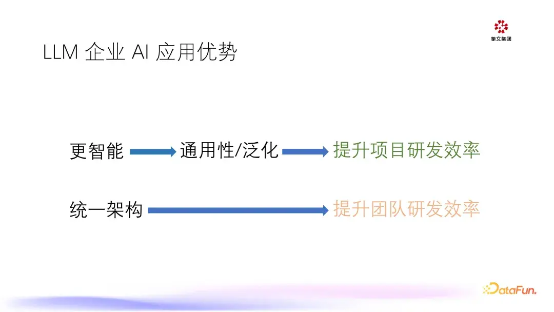 第三是具备统一的架构。不管如何进行模型选型,它们的架构都是基于 Transformer 的 Decoder Only 架构,开源模型也是如此,这样能够显著提升团队的研发效率。