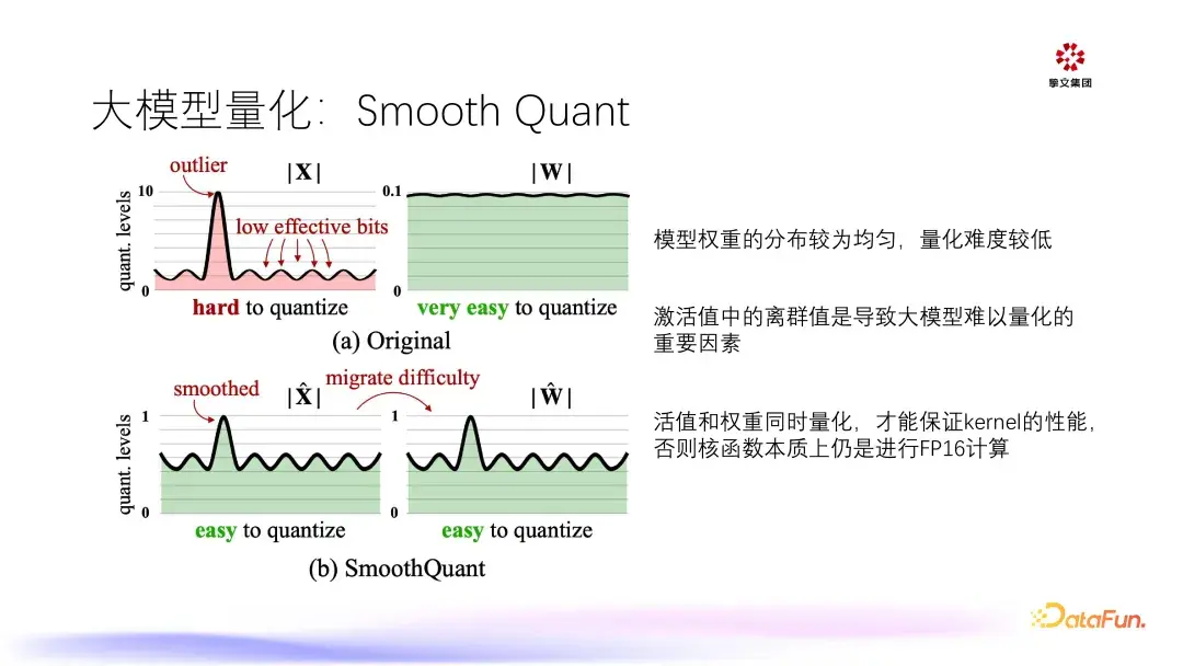 在机器学习模型中,很多时候就是做矩阵乘法,它包含权重和激活值两部分。权重的分布通常比较均匀,坡度也很少;而激活值会有明显峰值,这些峰值对应的数一般叫离群值。以往的量化大多只对权重做量化,在进行矩阵乘法前,都得先转成比如 float32,最终矩阵乘法还是用 float32 去算。