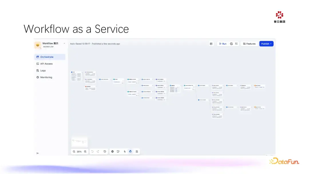从实践情况来看,我们有一个创新应用,算法同学借助这个平台的 workflow,在一个月内就迭代了 40 个版本。如果这 40 个版本依靠工程师去开发,仅需求沟通恐怕就得花费半个月时间。所以,这种模式对效率提升效果是非常显著的,只要了解大模型且有想法就能快速将想法付诸实践。