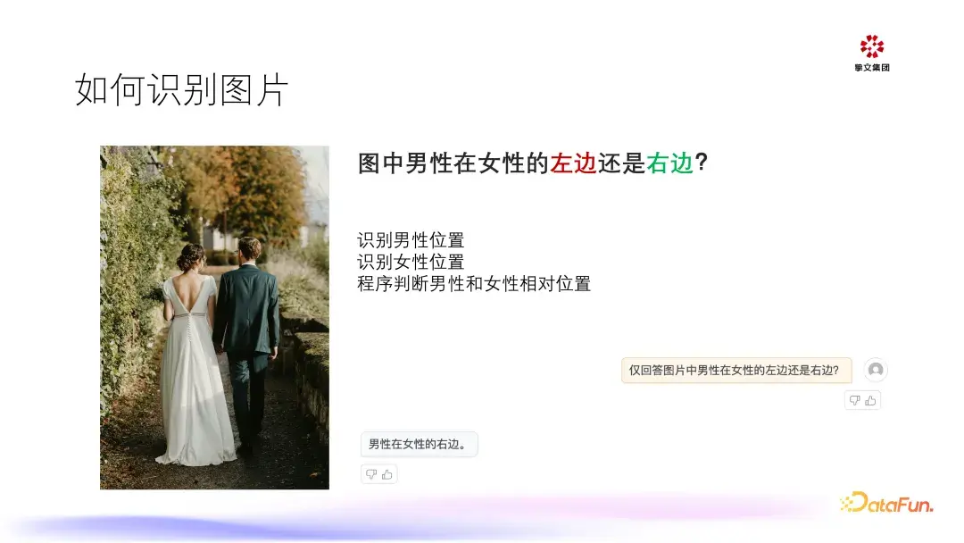 如上图,若由人来观察,能轻易分辨出图中男性在女性的右边。然而程序要如何知晓?若采用传统的机器学习方案,通常会启用一个模型,首先识别男性的位置,接着识别女性的位置,随后编写代码对框选区域进行判断,进而判断框选图像的像素相对位置。而到了新一代的大模型就非常简便了,直接向大模型提问,就能够得到精准的答案。
