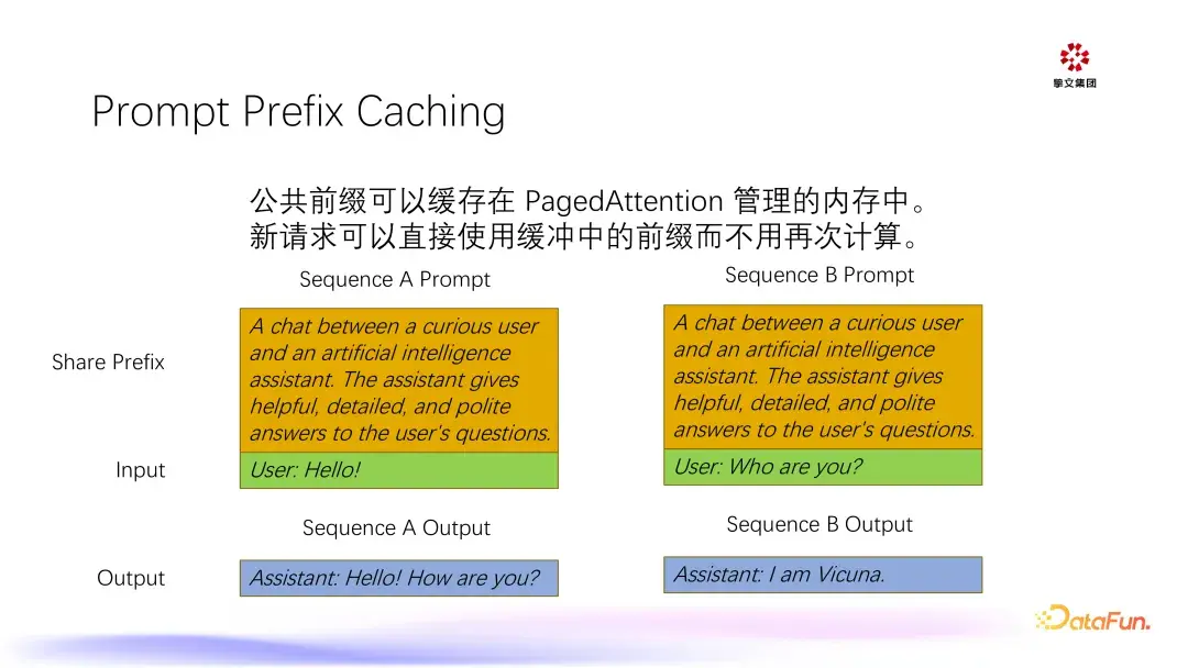 下面介绍 Prefix Caching。它基于一个基本假设,那就是大模型接收到的请求绝大多数时候其前缀都是一样的,比如常见的 system prompt 部分,只是 user 或者后续拼接的内容有所不同。在这种情况下,这部分对应的 KV Cache 可以缓存在 PagedAttention 管理的显存中,新请求到来时,可以直接使用缓存中的前缀,而无需再次计算,这样能够大幅减少计算量。