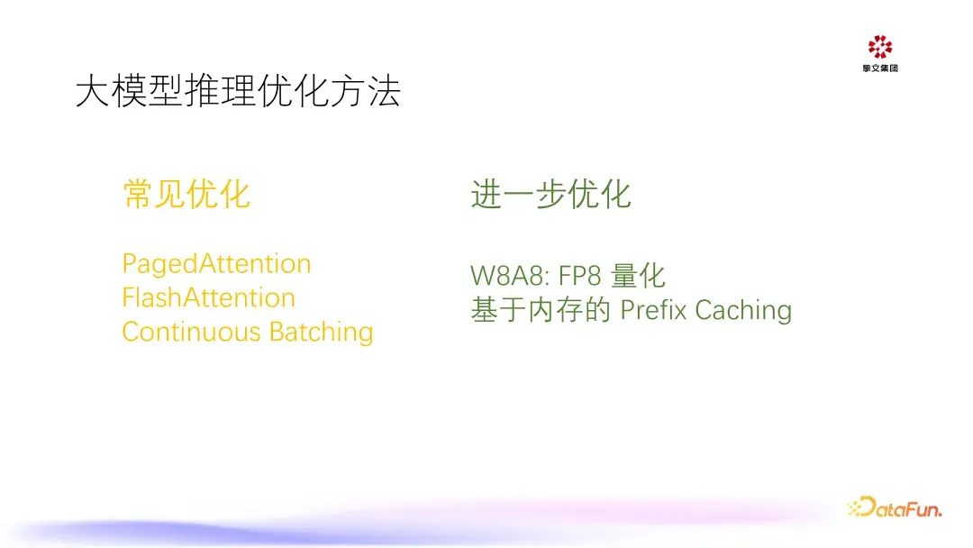 除常见优化手段外,我们还做了进一步探索,有两个较有效的优化手段,一是基于 W8A8、FP8 的量化(int8 量化会影响模型性能,对性能要求严的场景不太适用);另一个是基于内存的 Prefix Caching。