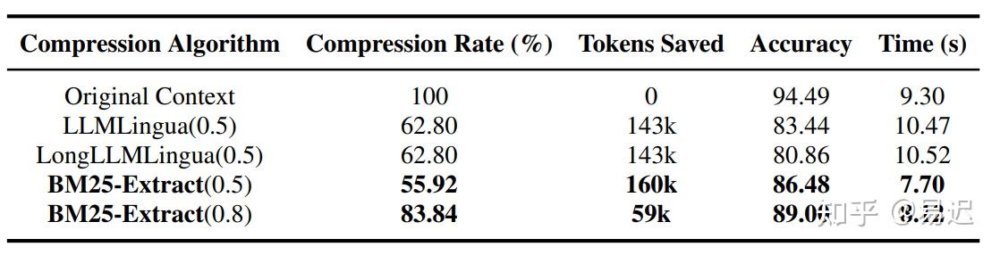 EasyRAG 采取的是基于 BM25 的压缩方案,实现方案比较简单:将检索的内容拆分为句子,然后使用 BM25 计算查询与每个句子之间的相似度,最后按照相似度递减的顺序将句子添加到列表中,直到达到设定的压缩率。实际与 LLMLingua 进行了比较, 从结果来看还是不错的: