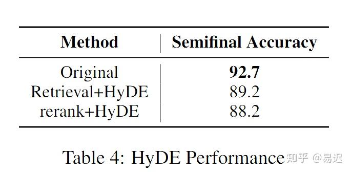 而且将 HyDE 生成的文档用于检索和重排序效果都不如直接使用原始问题。感觉这个方案有点类似 RAG + R 的方案,特定场景下相对原始的 HyDE 可能会有一些提升,后续可以进行一些尝试。