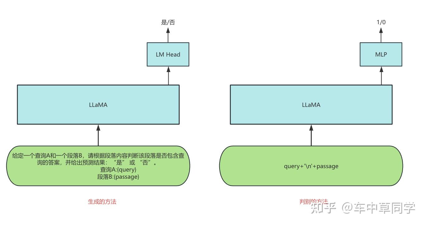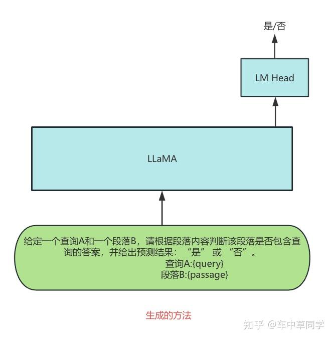 - 生成的方法:直接用生成的方法去做,输入query和doc,直接让大模型预测相关(是)和不相关(否)。