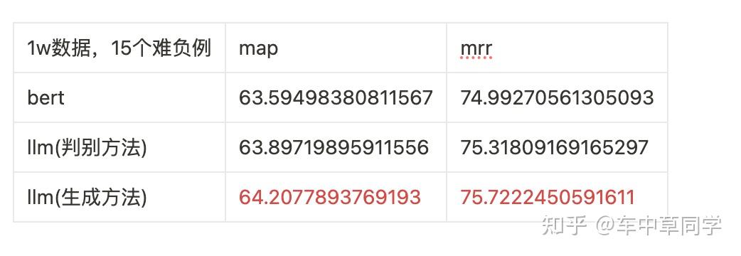 2.其中llm(生成方法)效果最好,在相同的数据情况下,其比bert的方法的map高了0.62,其比llm(判别)方法的map高了0.30。