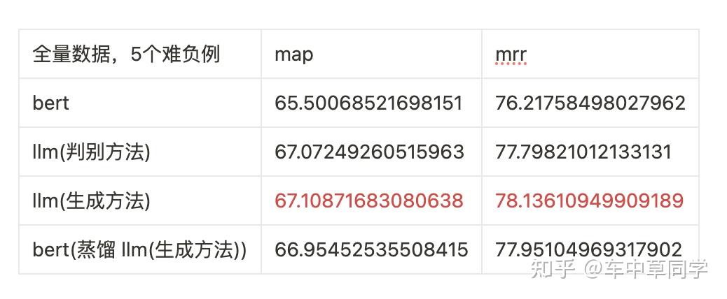 在数据量较少或者难负例较少的情况下,在相同的训练数据下,通过先训练llm(生成方法),再蒸馏到bert中,这样可以兼顾效果和效率。对于效果,蒸馏后的bert模型,可以比单纯只训练bert的map高了1.45,和训练llm(生成方法)只差了0.16。