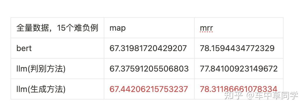 1.可以看出,在全量数据,15个难负例的情况下,bert的结果和两个基于llm的方法结果相差不大。