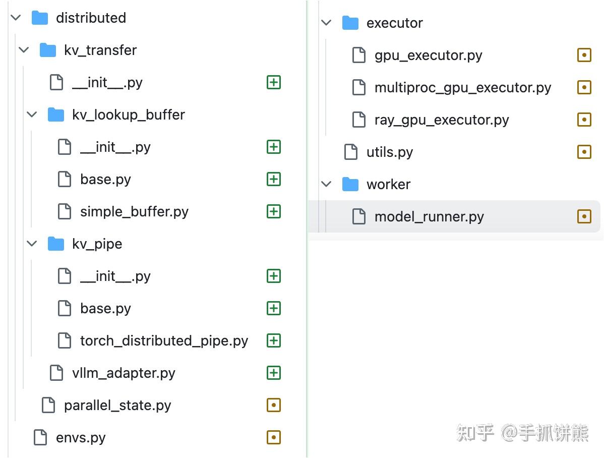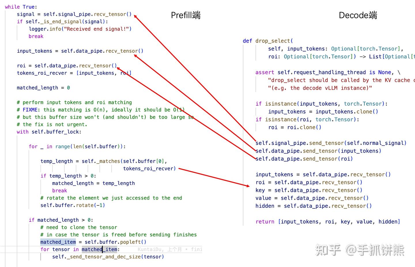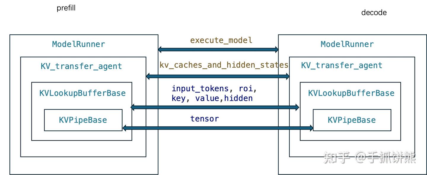 vLLM prefill和vLLM decode在接受到请求后都会执行ModelRunner的execute_model,依赖KV_transfer_agent类执行发送和接收所有attention layer的kv cache,KV_transfer_agent依赖KVLookupBufferBase执行单层attention layer的kv cache的发送和接收。KVPipeBase则提供最底层的tensor发送和接收(这里还有数据协议封装和进程控制,做过rpc的都了解,没做过rpc的可以从后面代码看到)。