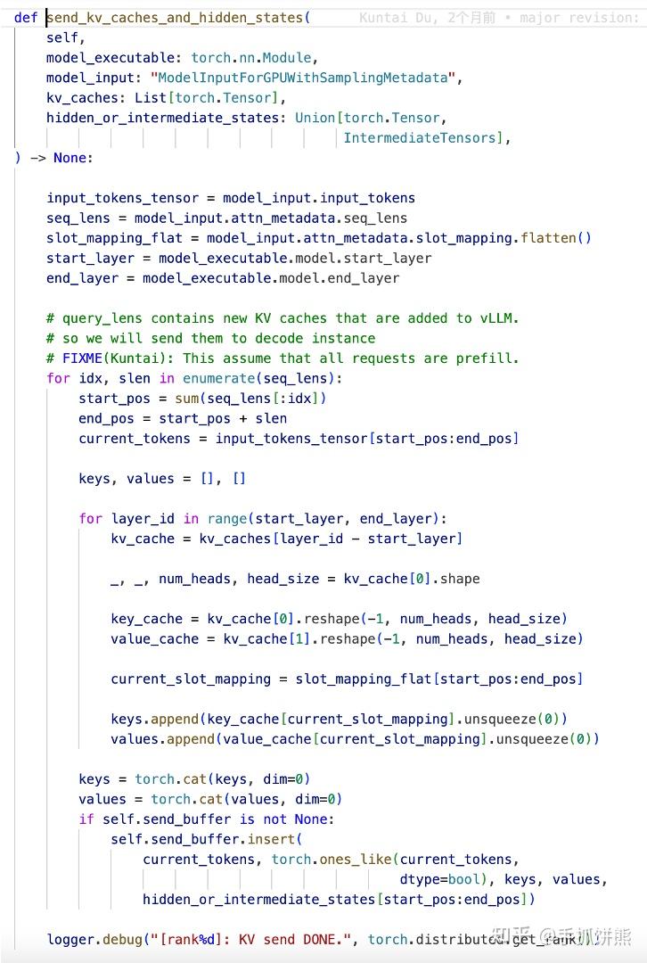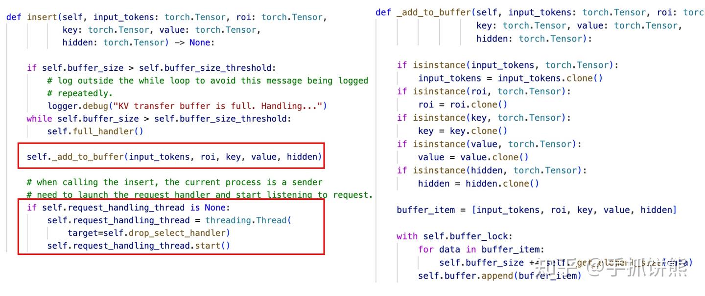 kv_buffer:我们可以看到kv_pipe发送是基础的torch的Tensor,这个比较底层,不是很好用,需要进一步抽象才能给上层用,即kv buffer,我们可以看到,这个kv_buffer有insert和drop_select 2个函数,vLLM prefill使用insert发送kv数据, vLLM decode接受kv数据,交换的消息是 input_tokens, roi, key, value, hidden这些数据,数据的粒度是attention一层的。
