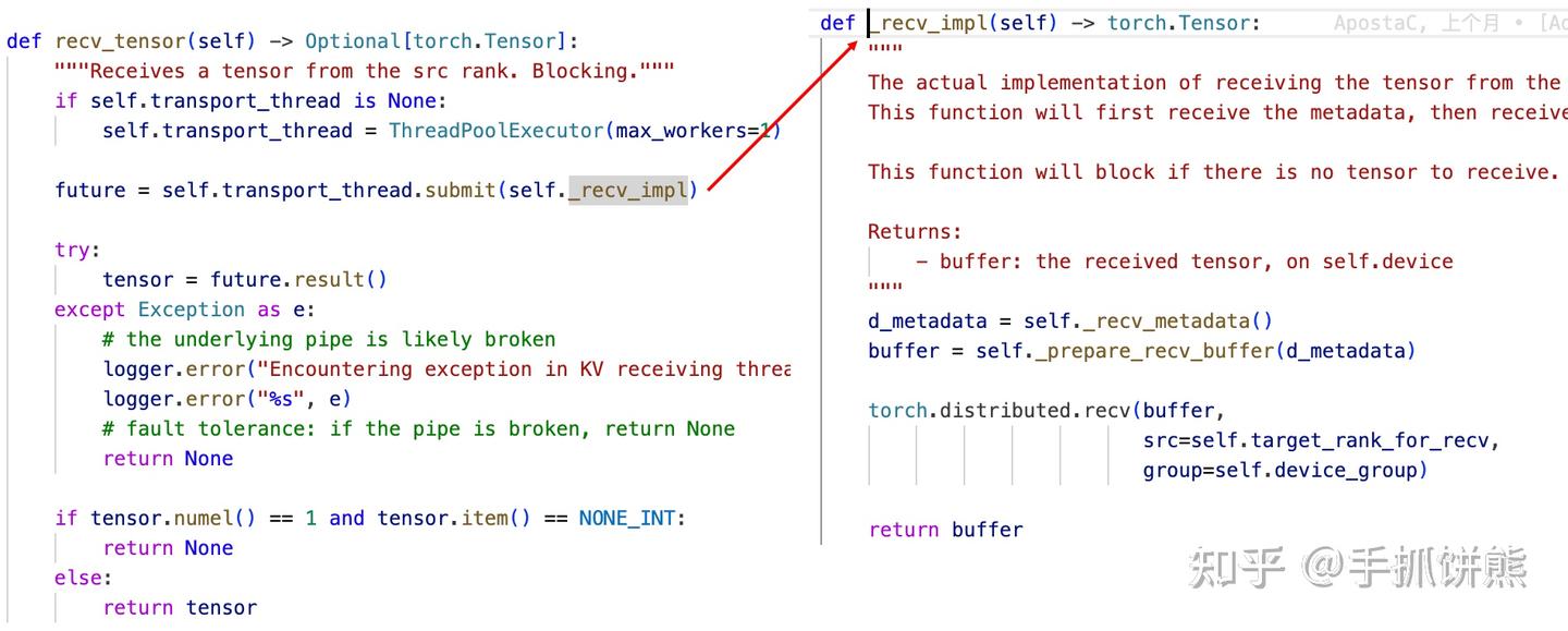 上述代码是recv_tensor的实现,我们看到它确实实现recv一个metadata,然后再recv真正的tensor。下图是prefill和decode的pipe类的发送和接收线程栈图。